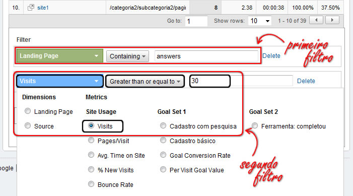 Apesar de termos utilizado um filtro simples, é possível utilizar o filtro avançado para realizar análises ainda mais interessantes. Por exemplo, vamos supor que desejamos verificar o desempenho das páginas que obtiveram um número mínimo de 30 visitas de um determinado referral. Para tanto é necessário configurar o filtro avançado (opção Advanced Filter) da seguinte maneira: