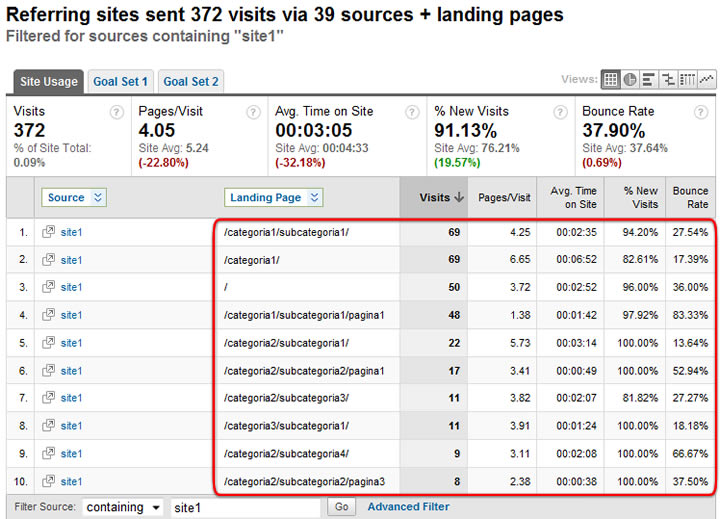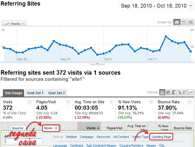 Mas você já pensou em verificar quais páginas tem melhor desempenho em cada um desses sites? Para tanto basta filtrar pelas visitas do referral que você deseja analisar, manter “Source” na primeira caixa de seleção, selecionar a opção “landing page” na segunda caixa.