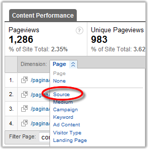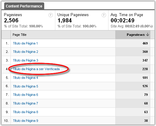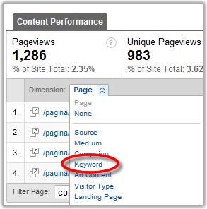 Uma maneira de verificar como os usuários estão chegando às páginas do seu site é verificar as keywords e as fontes de tráfego de entrada de cada página. Para tanto, você deve acessar os dados da página que você deseja verificar através do menu Traffic Sources->Content->Content by Title: