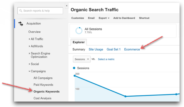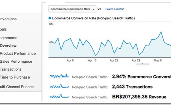 Um ponto muito interessante é que os dados do E-commerce também ficam disponíveis em vários dos outros relatórios do Google Analytics, como no relatório de tráfego orgânico, por exemplo: