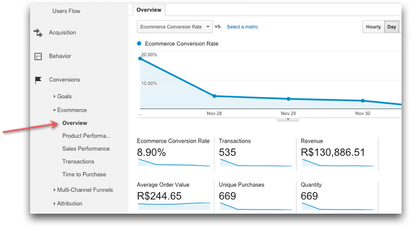 Com o código sendo utilizado corretamente, agora o próximo passo é utilizar os dados gerados. Os relatórios de e-commerce estarão diponíveis dentro do menu Conversions, último listado entre os Standard Reports: