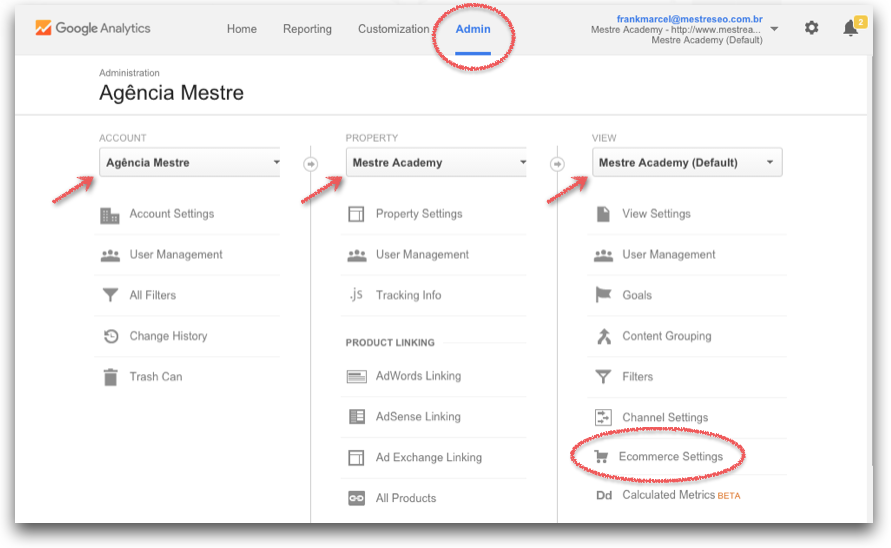 Entretanto, antes de instalar o código nas páginas de feedback, o primeiro passo é informar ao Google Analytics que o site em questão trata-se de um e-commerce. Para tanto, é necessário acessar a área de Admin da conta no Google Analytics do site, escolher o perfil em que será feita a configuração, e acessar a opção de configuração de ecommerce: