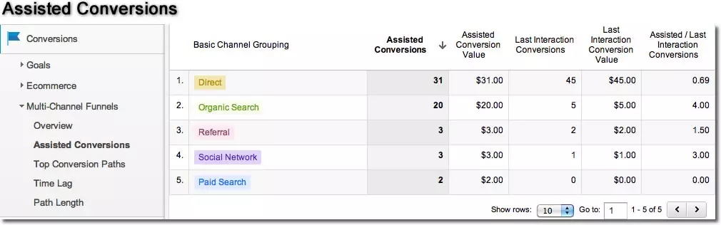 Ou seja, o valor registrado no Assisted Conversions é uma contagem simples de quantos caminhos o canal esteve envolvido sem ser o último passo. O Last Interaction Conversion é uma contagem simples de quantas vezes o canal foi o último passo do caminho de conversão.