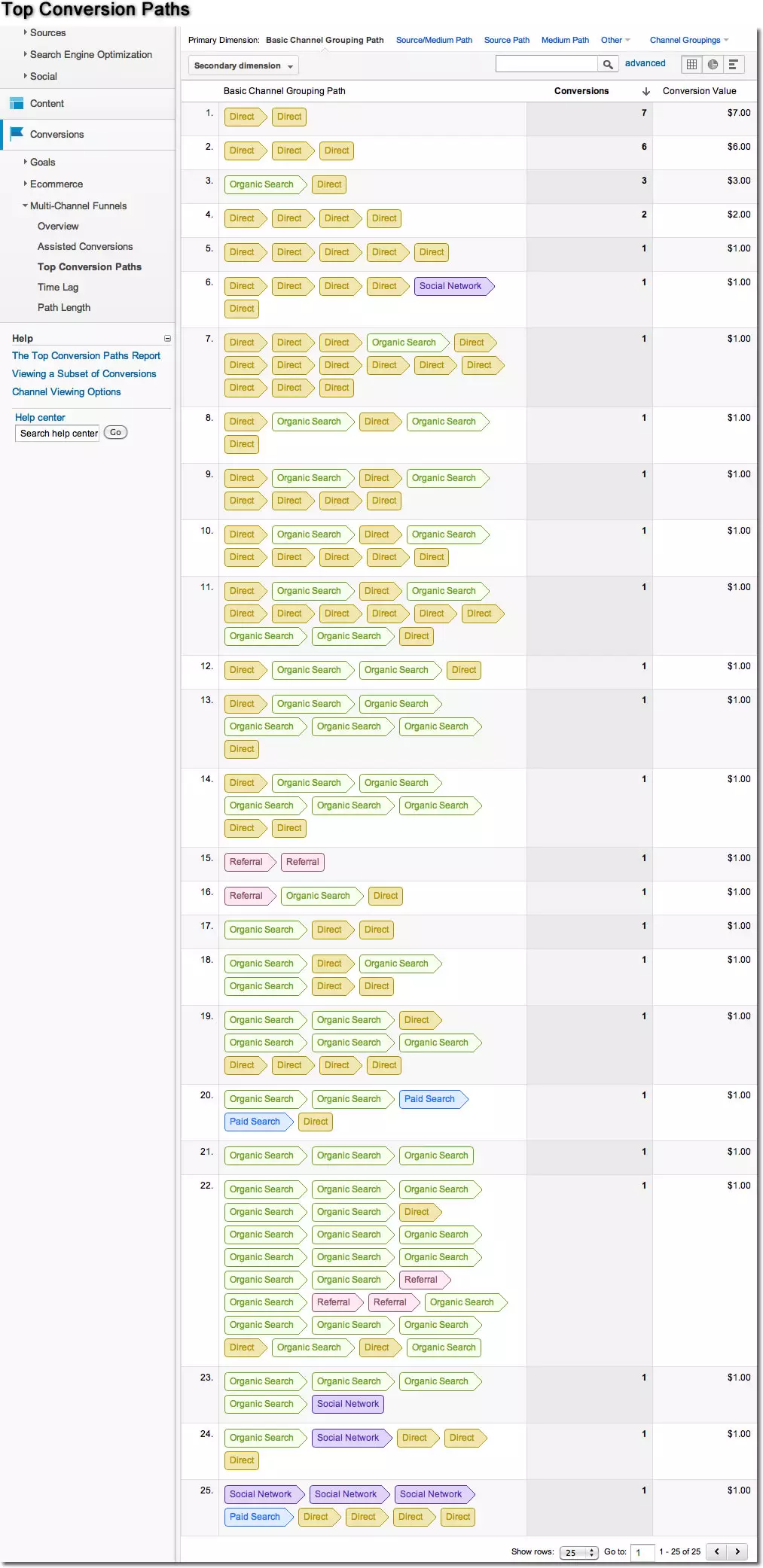 Agora vem o mais importante da interpretação do Funil Multi-canal: Veja na tabela Assisted Conversions que Social Network está associada a 3 assistências a conversão que geraram o valor $3.00 para o site; e também a 1 Last Interaction, que gerou valor 1. Para entender exatamente o que isto significa, veja na tabela Top Conversion Paths que o canal Social Network se envolveu em 4 caminhos de conversão: