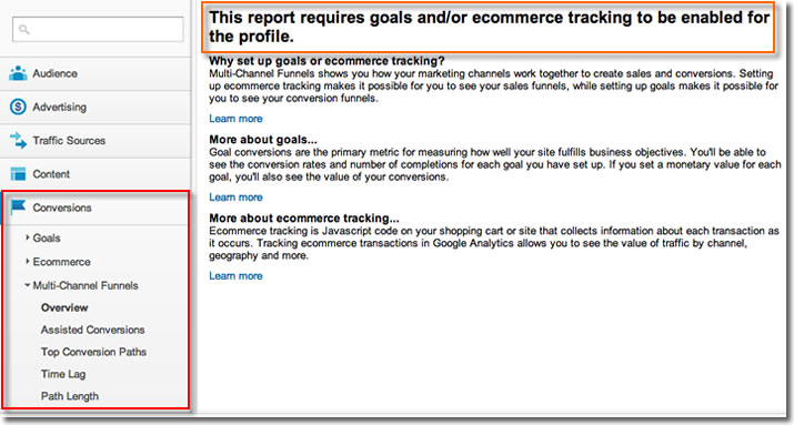 Como se trata de um sistema para análise de conversão, naturalmente, é preciso que você tenha no seu site a configuração de alguma forma de conversão: Goals (Metas) e/ou Ecommerce.