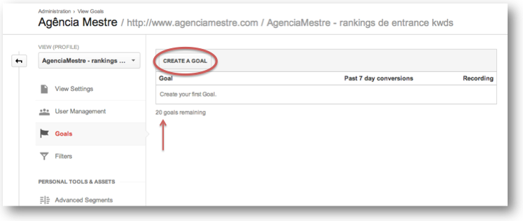 É possível configurar até 20 metas no Google Analytics e para chegar até o painel de configuração de Goals acesse a área de administrador e escolha o perfil no qual você quer configurar Goals: