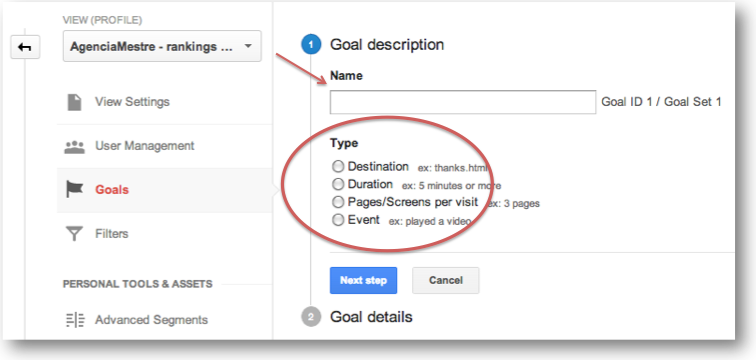 Primeiro, vamos passar pela configuração de cada tipo de Goal, depois vamos ver onde os relatórios de Goals ficam localizados no Google Analytics.
