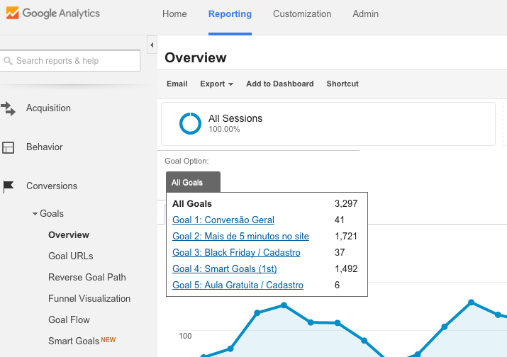 E, para tanto, basta acessar o menu referente às metas (ou goals) no Analytics e você verá informações referentes a todas as Metas, ou ainda poderá escolher qual meta analisar isoladamente a partir do Overview:
