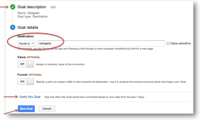 Em metas deste tipo, Destination, é possível configurar ainda a opção do Funil de Conversão, para o qual dedicamos um artigo inteiro somente sobre ele. Anote aí para ler logo em seguida: Funil de Conversão no Google Analytics – Criar e Analisar.