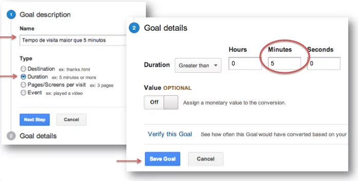 - Duration: Para o objetivo de ter a pessoa navegando por mais do que um determinado tempo (ou menos). Um site de busca, talvez queria os usuários navegando por apenas 1 segundo; Um site de vídeos, talvez queira os visitantes no site por pelo menos o tempo médio de duração do vídeo;