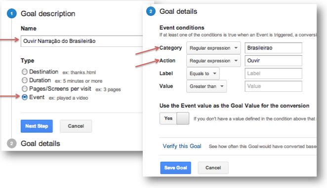 Habituando-se ao Event Tracking, a criação de Goal deste tipo fica bastante intuitiva: