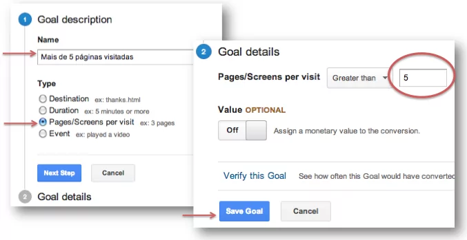 Este tipo de Meta é tão óbvio no nome quanto é para configurar. É uma contagem simples de páginas visualizadas por um visitante durante uma sessão. Quando ele passa do mínimo que você indicar, o Google Analytics registra uma conversão.
