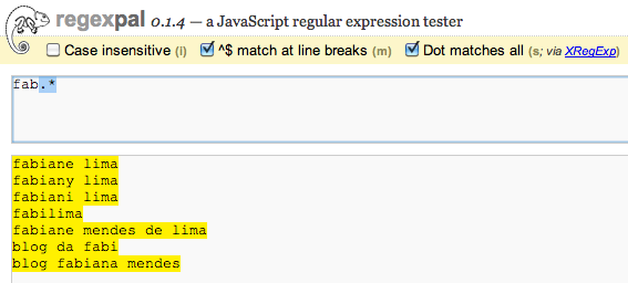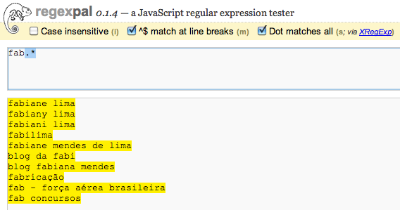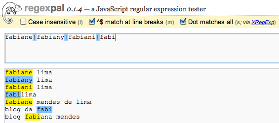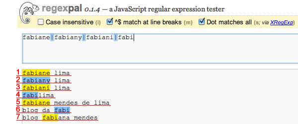 A expressão regular dada no início desse artigo, ‘fabiane|fabiany|fabiani|fabi’, significa: pegue os termos que contém “fabiane”, ou “fabiany”, ou “fabiani” ou, ainda, “fabi”. Fazendo o teste na regexpal, temos o seguinte resultado: