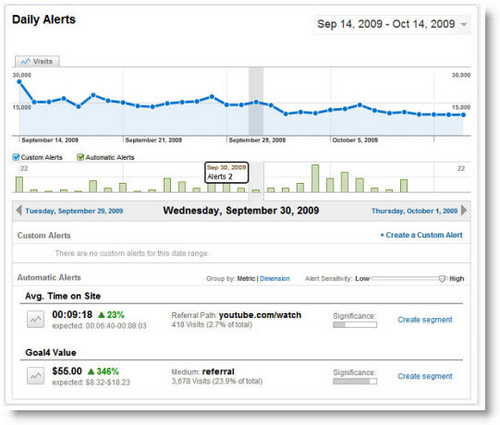 Este recurso já possui alertas criados automaticamente que vão te avisar quando page visits, bounce rate, goal conversion, avg. time on site entre outros apresentarem alguma alteração incomum. Os alertar podem ser diários, semanais ou mensais.