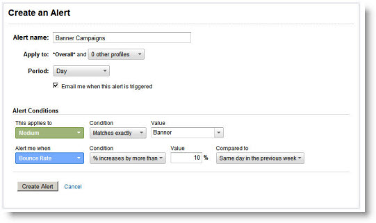 Pode se restringir o foco do alerta para tipo de visitante, cidade/região, source, keyword entre outras quando há variações de bounce rate, new visits, page visits como falado anteriormente e você especifica o valor dessa variação em porcentagem e o período a ser comparado.