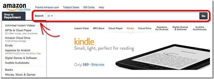Um dos locais mais apropriados para a busca interna é nas proximidades do menu de navegação do usuário. Abaixo, seguem dois exemplos de sites de e-commerce que utilizam esse local para a busca interna: Amazon: