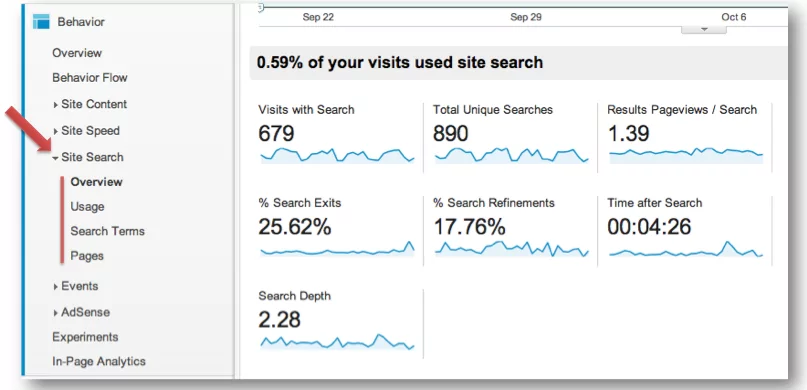 Uma vez que o site já tem a busca interna configurada, ou seja, já tem uma barra de pesquisas e fornece resultados em URLs diferentes de acordo com a pesquisa realizada, é possível utilizar o Site Search do Google Analytics.
