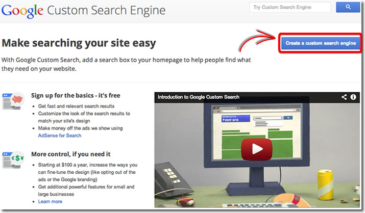 Uma das maneiras de implementar a busca interna do site é através do uso da própria plataforma do Google para fazer a busca interna de seu site. Para tanto, basta acessar o endereço do Google Custom Search: E acessar a opção “create a custom search”: