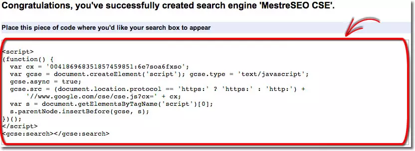 Após clicar em “Create,” você receberá o código da Custom Search Engine que você acabou de criar. Basta incluí-la em seu site e ela estará pronta para uso.